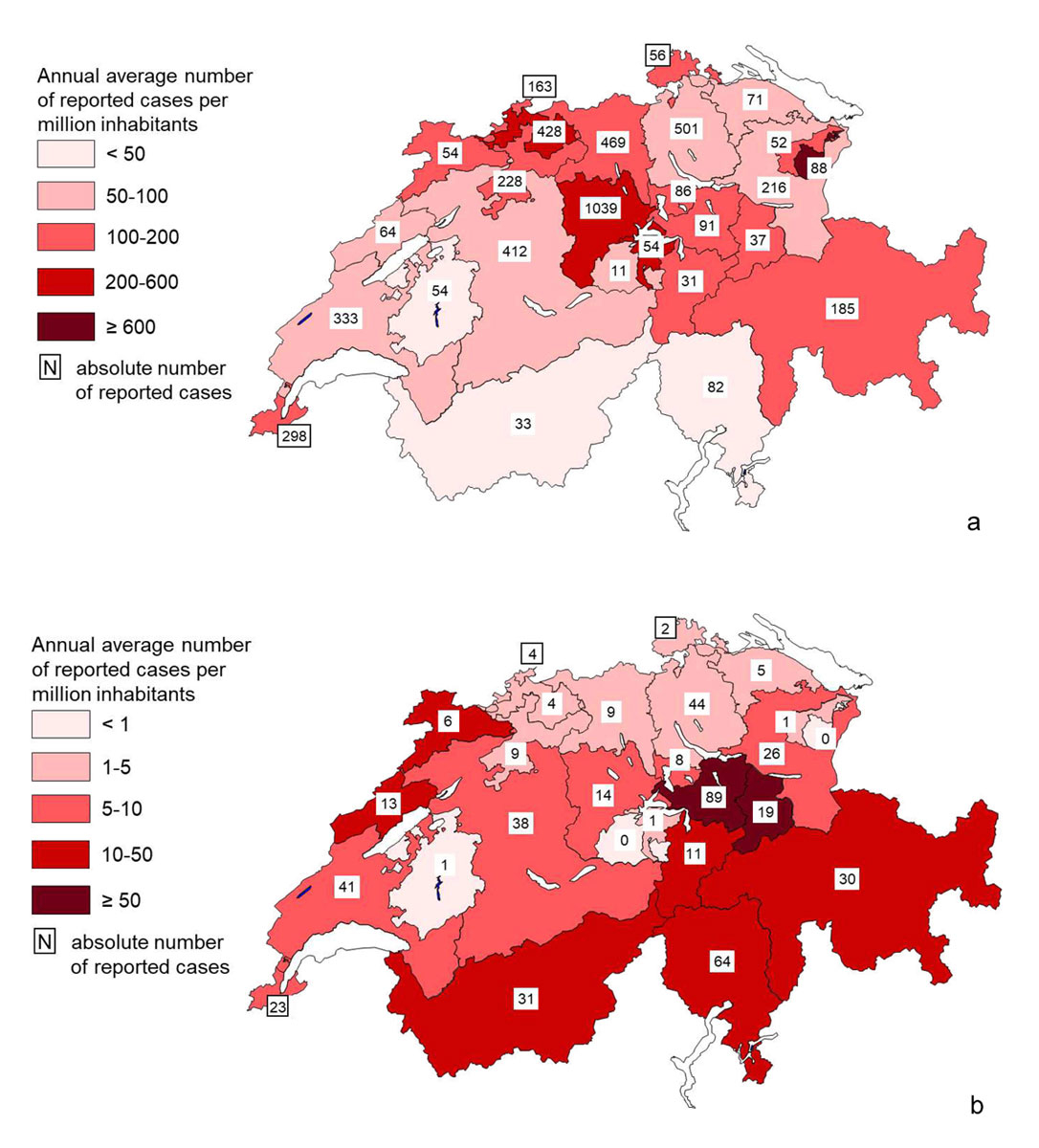 It should be noted that usually a single outbreak in a canton lasting for a limited period is the cause of the high cantonal incidences shown in figure 4, and this applies not only to the epidemic period but even more so to the post-epidemic period. The most notable exception is the canton of Lucerne which recorded three successive epidemic waves between 2007 and 2009.