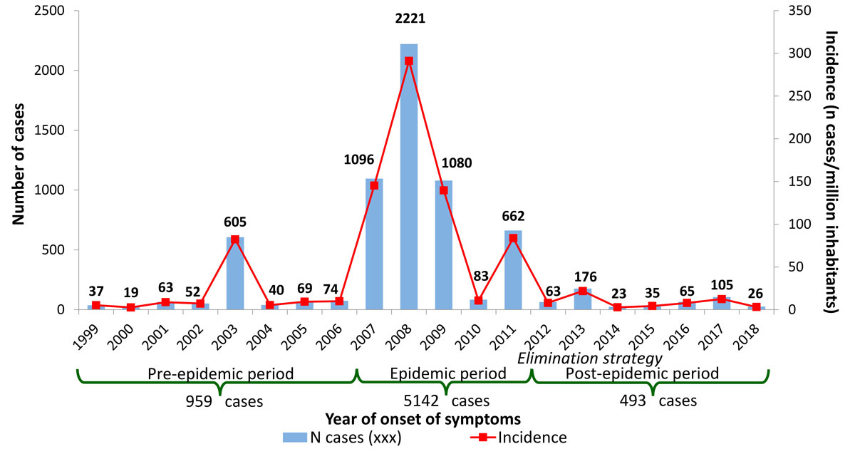 Between 1999 and the end of July 2018, 6 594 cases of measles were reported. These 20 years of surveillance comprise three epidemiological periods (fig. 1):
