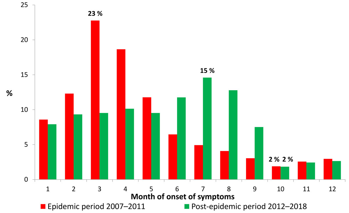During the epidemic period, the number of reported cases peaked in March and April, and was lowest during the third and particularly the fourth quarters of the year (fig. 2). During the post-epidemic period, the seasonality of virus transmission was less marked and the peak shifted towards the summer months, with the fewest cases occurring in the fourth quarter.
