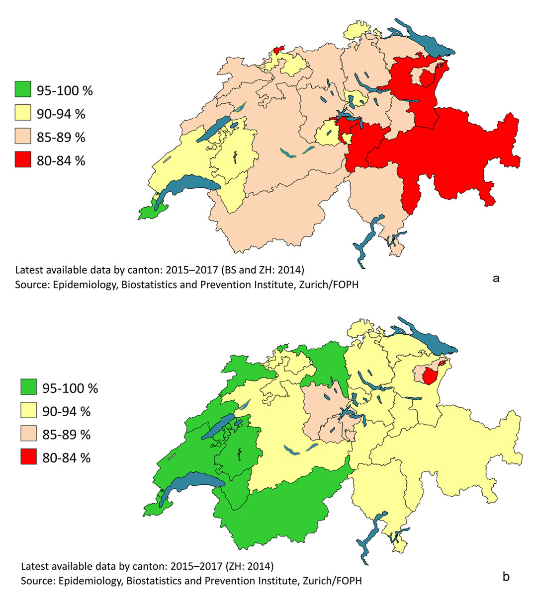Figure 7 Measles vaccination coverage by canton in Switzerland, 2015–2017. (a) Two doses at age 2. (b) Two doses at age 16.