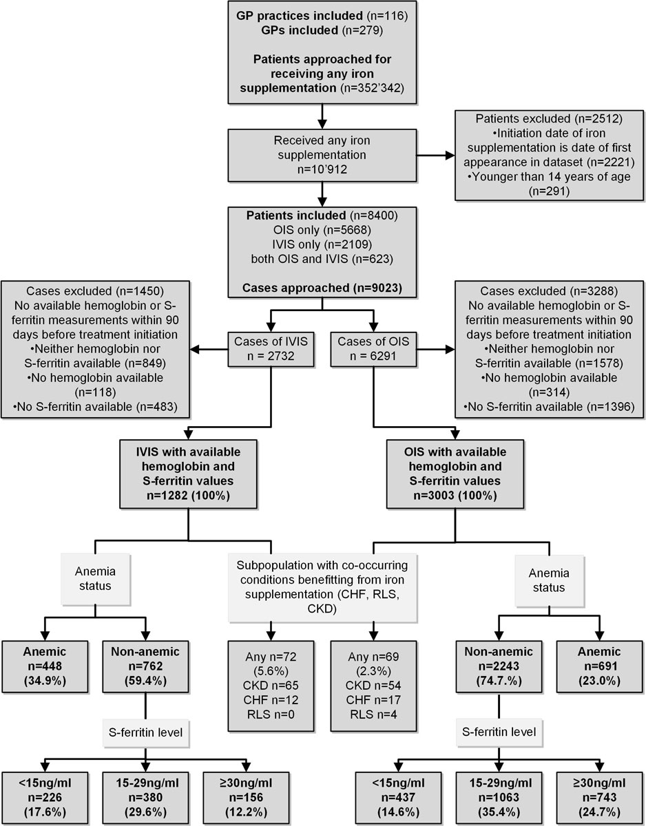 Figure 1 Study design and inclusion/exclusion criteria including numbers of patients and cases. GP = general practitioner; OIS = oral iron supplementation; IVIS = intravenous iron supplementation; S-ferritin = serum ferritin; CHF = chronic heart failure; RLS = restless legs syndrome; CKD = chronic kidney disease stage 3b or higher