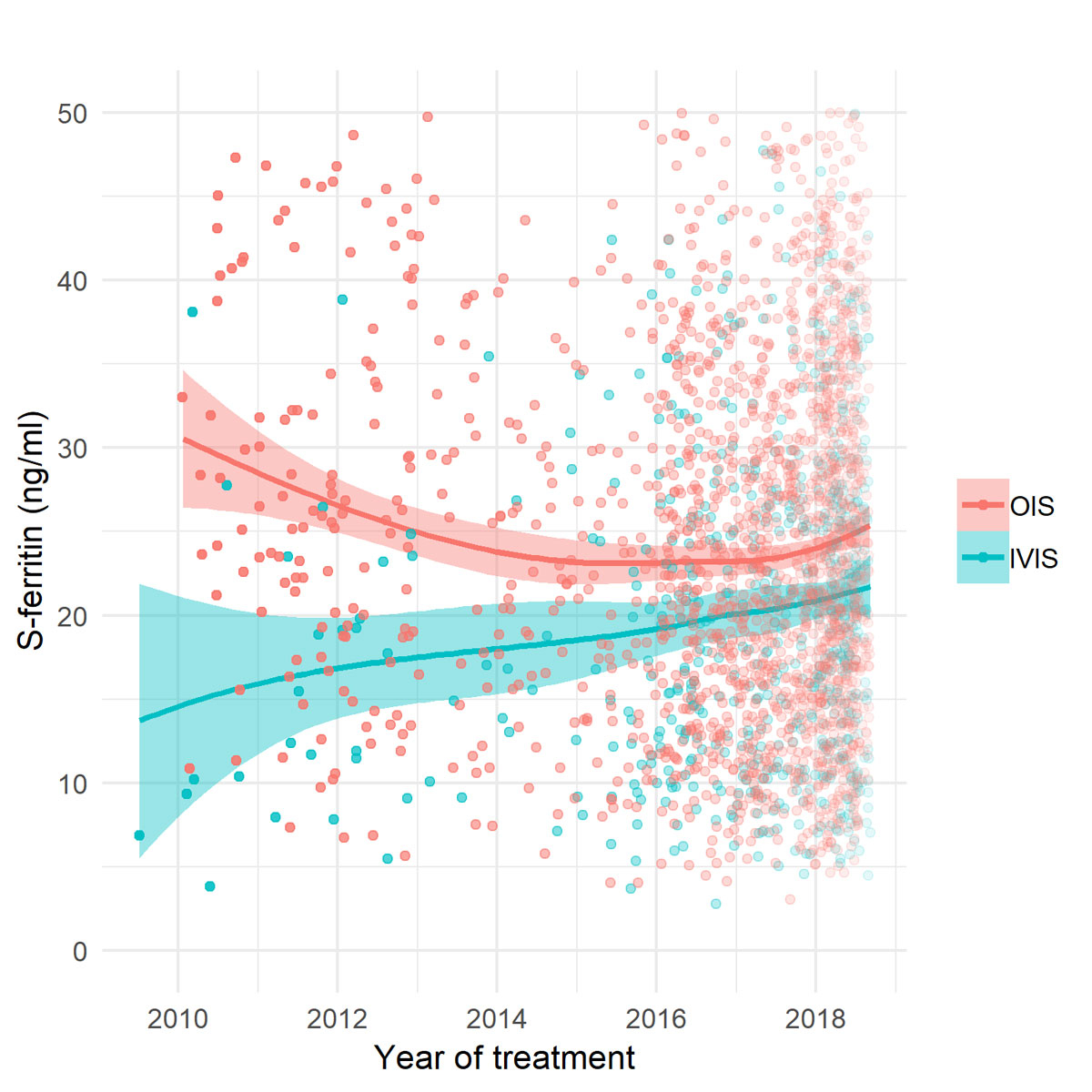 Figure 3 Pretreatment serum ferritin in patients with non-anaemic iron deficiency treated with OIS (red) and IVIS (blue). Curves are fitted with a least squares regression in localised subsets. OIS = oral iron supplementation; IVIS = intravenous iron supplementation; S-ferritin = serum ferritin
