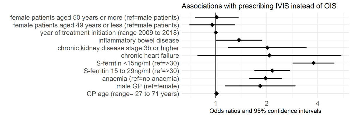 Figure 2 Odds ratios and 95% confidence intervals of variables’ associations with prescribing IVIS instead of OIS, n = 3484. OIS = oral iron supplementation; IVIS = intravenous iron supplementation; S-ferritin = serum ferritin; GP = general practitioners