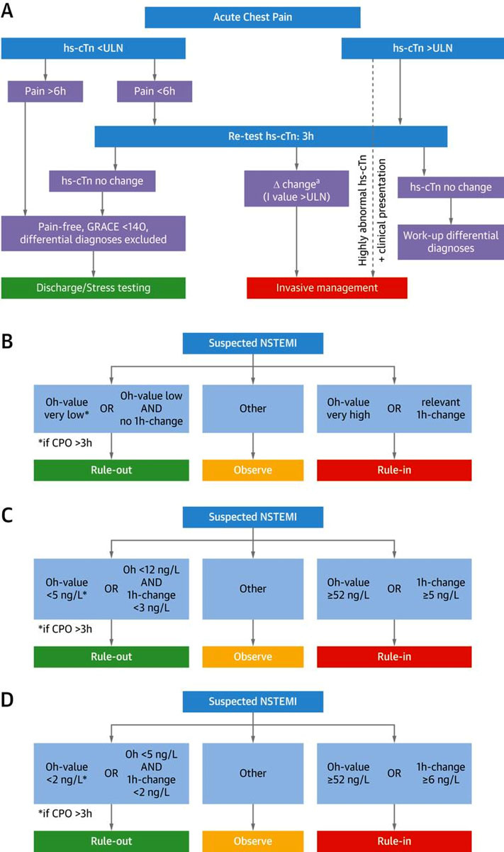 Figure 2 European Society of Cardiology (ESC) rapid triage algorithms. (A) The ESC 0/3h rule-out and rule-in algorithm of non–ST-segment–elevation myocardial infarction (NSTEMI) using high-sensitivity cardiac troponin (hs-cTn) assays. (B) The ESC 0/1h rule-out and rule-in algorithm using hs-cTn assays in patients presenting with suspected (NSTEMI) to the emergency department. (C) The ESC 0/1h rule-out and rule-in algorithm with assay-specific cutoff values for the Elecsys® hs-cTnT assay by Roche.