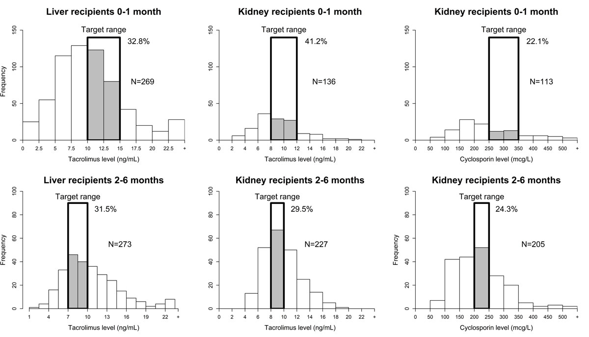 Reducing adverse events associated with the use of immunosuppressants is a major goal in solid organ transplantation [13, 14]. However, this has to be weighed against the risks of under-immunosuppression and consequent early or late acute or chronic rejection. TDM is one way to evaluate and adjust dosages of immunosuppressive agents [14, 15]. In our cohort of LT and KT recipients, only between 22 and 41% of patients had reached the target trough level for their immunosuppressive medication at the end of the first month after transplantation, and the results were even less satisfactory between the second and sixth months after transplantation, when as few as a quarter of patients were within the target range.