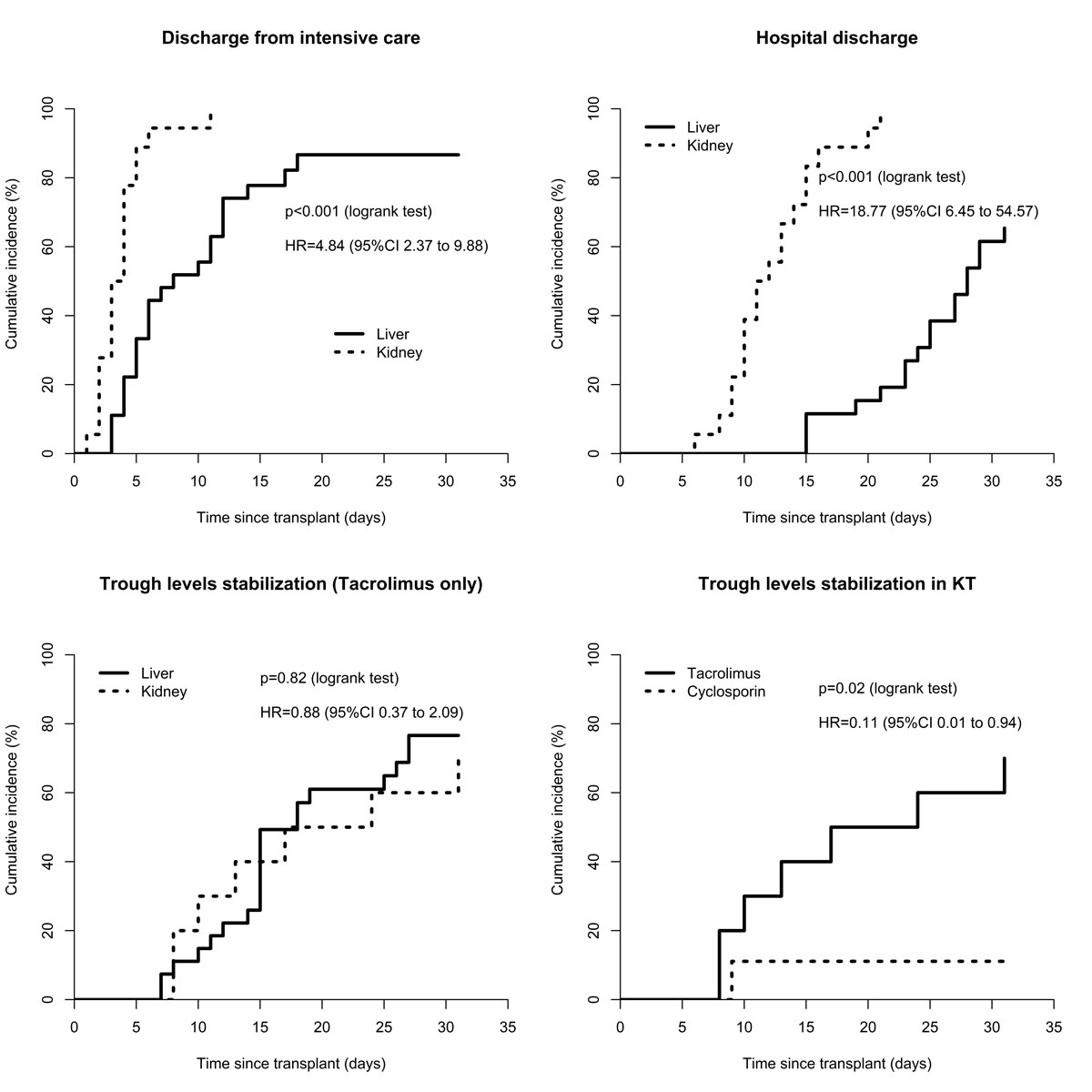 The cumulative stabilisation incidence, intensive care and hospital discharge, was assessed using Kaplan-Meier methods. The log-rank test was used to compare LT and KT, and to compare tacrolimus and ciclosporin treatment in KT patients. Results were expressed as median survival times in days and 95% confidence interval (CI).