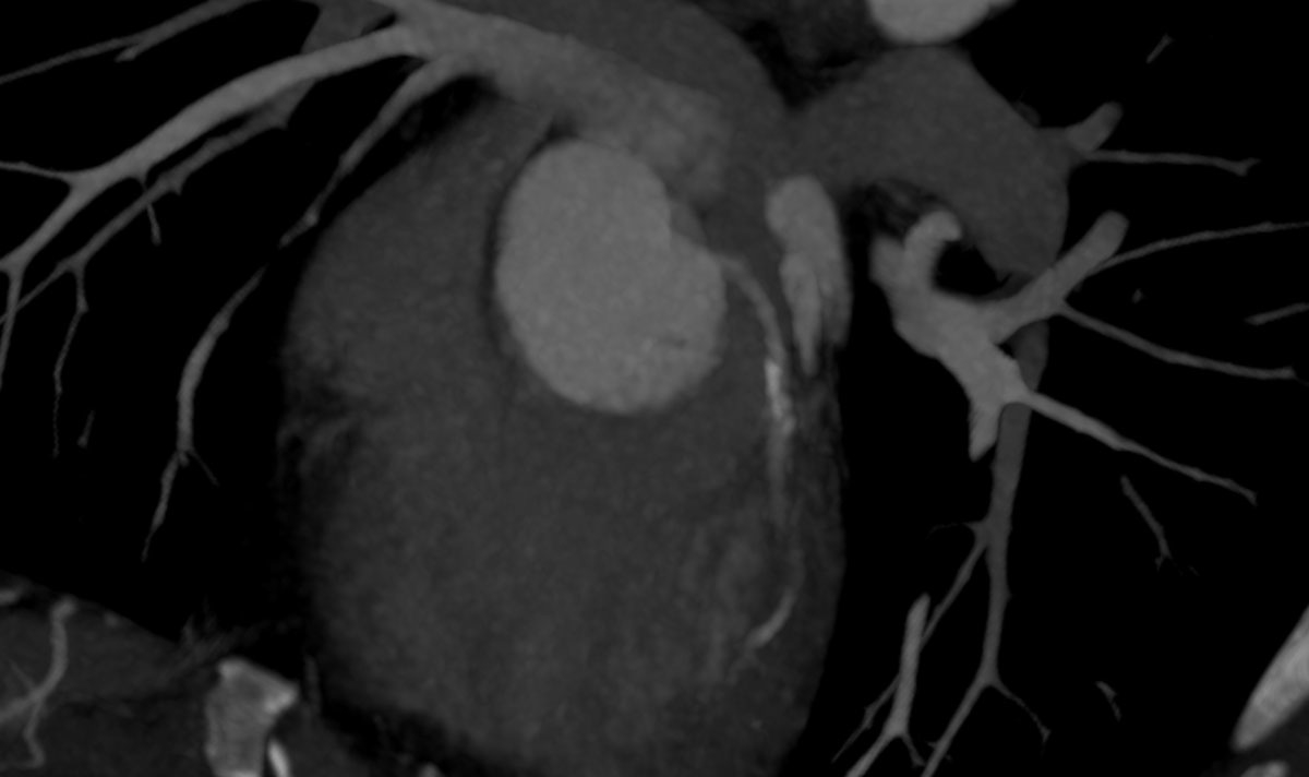 Figure 1 Axial CT scan of the left coronary artery in a 43-year old ED patient showing coronary artery calcification which led to a coronary angiogram.