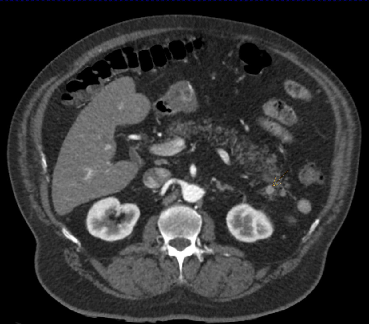 Figure 3 Axial CT scan of a neuroendocrine pancreatic tumour incidentally diagnosed in a 67-year old ED patient.