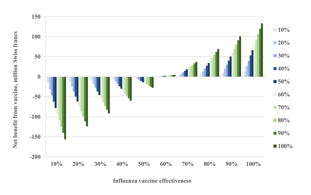 Figure 1 shows the net benefit of influenza vaccination in the 19‒65 years age group as a function of vaccine coverage. At a low vaccine coverage of only 10%, a marginally effective vaccine with an efficacy of 10% results in a loss of CHF 15.6 million, whereas an efficacy of 40% results in a loss of CHF 6.0 million and an efficacy of 80% in a CHF 6.9 million net benefit. If the vaccination coverage rate were 50%, the corresponding costs would be CHF 77.9 million for 10% efficacy and CHF 29.8 million for 40% efficacy, and the benefit for 80% efficacy could reach CHF 34.4 million. A vaccination coverage rate of 100% would result in losses of CHF 155.9 million for 10% efficacy and CHF 59.5 million for 40% efficacy, or lead to a net benefit of CHF 69.0 million at 80% efficacy.