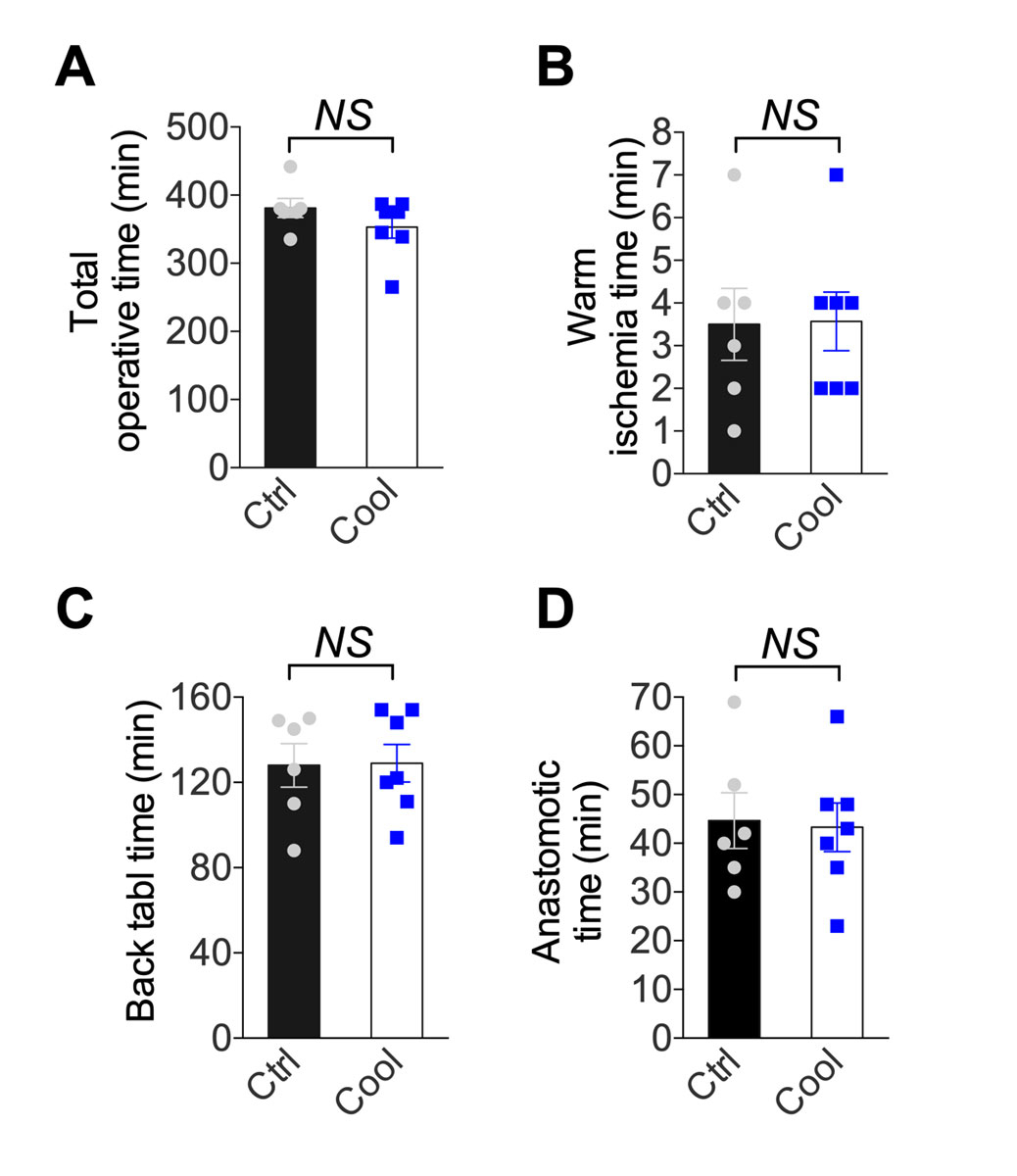 Figure 3 Intra-operative data. (A) Total operative time, (B) warm ischaemia time, (C) back table time, (D) anastomotic time from control and cooling kidney (n = 6–7). Errors bars indicate the standard error of the mean. NS = p >0.05; Ctrl = control