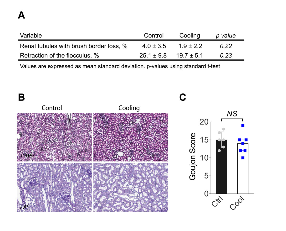 Figure 4 Histological analyses following kidney reperfusion. (A) Percentage of lumina of tubules with cellular debris, the percentage of brush border loss, tubular dilatation, and percentage of floculus retraction in Bowman's space. (B) Representative kidney histological sections stained with periodic acid-Schiff (proximal tubular lesions) and Jones (glomerular injury). (C) Goujon score (lesion severity) was graded 0 to 10 for each type of lesion (n = 6–7). Error bars indicate the standard error of the mean. NS = p >0.05; Ctrl = control.