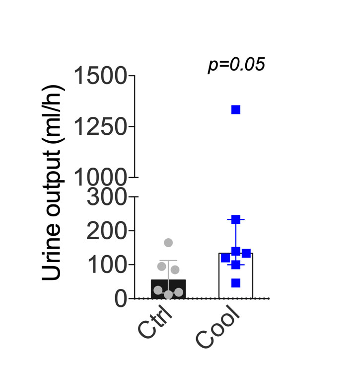 Following ischaemia and reperfusion, kidneys are at risk of delayed function, characterised by a reduction in urine output. On a cellular level, IRI induces glomerular floculus retraction, brush border loss and tubular dilatation. IRIs injuries were slightly reduced in the group with cooling as compared with the control group (fig. 4), but this was not statistically significant. In the cooled group, the percentage of glomeruli with Bowman’s spaces showing a retraction of the flocculus was lower than in the control group. However, the amount of cellular debris, brush border loss and dilated tubules were similar. When these changes were analysed independently, no significant difference was observed (fig. 4A and B). The Goujon score [18], which combines all the previous histopathological observations into a score, suggested that cooling protected from IRI (fig. 4). Urine output within the first days after transplantation defines graft function and thus allows functional assessment of kidney function following IRI. Within the first hour after reperfusion, urine output was higher in cooled kidneys than in the controls (fig. 5). This is consistent with a protective effect of continuous intra-abdominal cooling during transplantation.