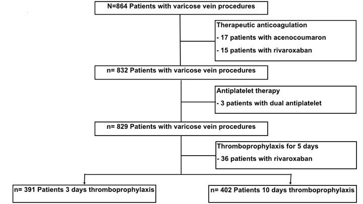 From February 2009 to December 2015, 864 patients were treated with EVLA of truncal varicose veins. Thirty-five cases were excluded as the patients were on therapeutic dose anticoagulation with acenocoumaron (n = 17) and rivaroxaban (n = 15) or on dual antiplatelet therapy (n = 3). Of the remaining 829 cases, another 36 were excluded from our analysis as the patients received pharmacological thromboprophylaxis for 5 days and the case number was too low for analysis.