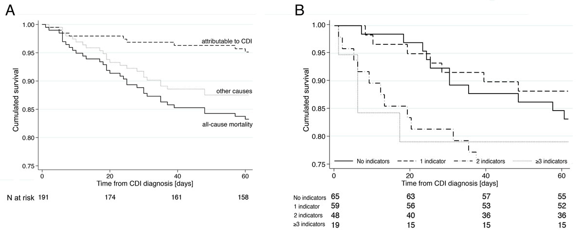 Figure 3 A: Kaplan-Meier curve showing all cause 60-days-mortality (solid), mortality attributable to Clostridioides difficile infections (CDI, dashed) and mortality related to other causes (dotted). B: Overall mortality by number of indicators for severe CDI (temperature ≥38.5°C, leucocytes >15 × 109/l, creatinine increase ≥1.5 times baseline, albumin <25 g/l).