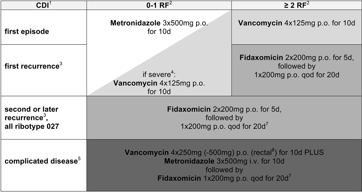 For almost three decades metronidazole has been considered the treatment of choice, but recent publications and international guidelines have increasingly favoured other treatment regimens [10, 11]. Vancomycin was shown to outperform metronidazole particularly in severe and complicated CDI, and fidaxomicin showed significantly lower recurrence rates than both metronidazole and vancomycin [10]. In a retrospective analysis, Patel et al. showed an increase in recurrence and mortality rates if CDI was undertreated relative to Infectious Diseases Society of America (IDSA) 2010 guidelines [12], which required the replacement of metronidazole by a more potent drug according to disease severity and risk factors for recurrence [12]. The 2017 IDSA guidelines suggest vancomycin or fidaxomicin, with preference for tapered vancomycin or fidaxomicin for recurrent infections. Metronidazole was mostly abandoned [13]. Despite such evidence metronidazole is still broadly considered the treatment of choice for CDI in Switzerland and in many parts of the world.
