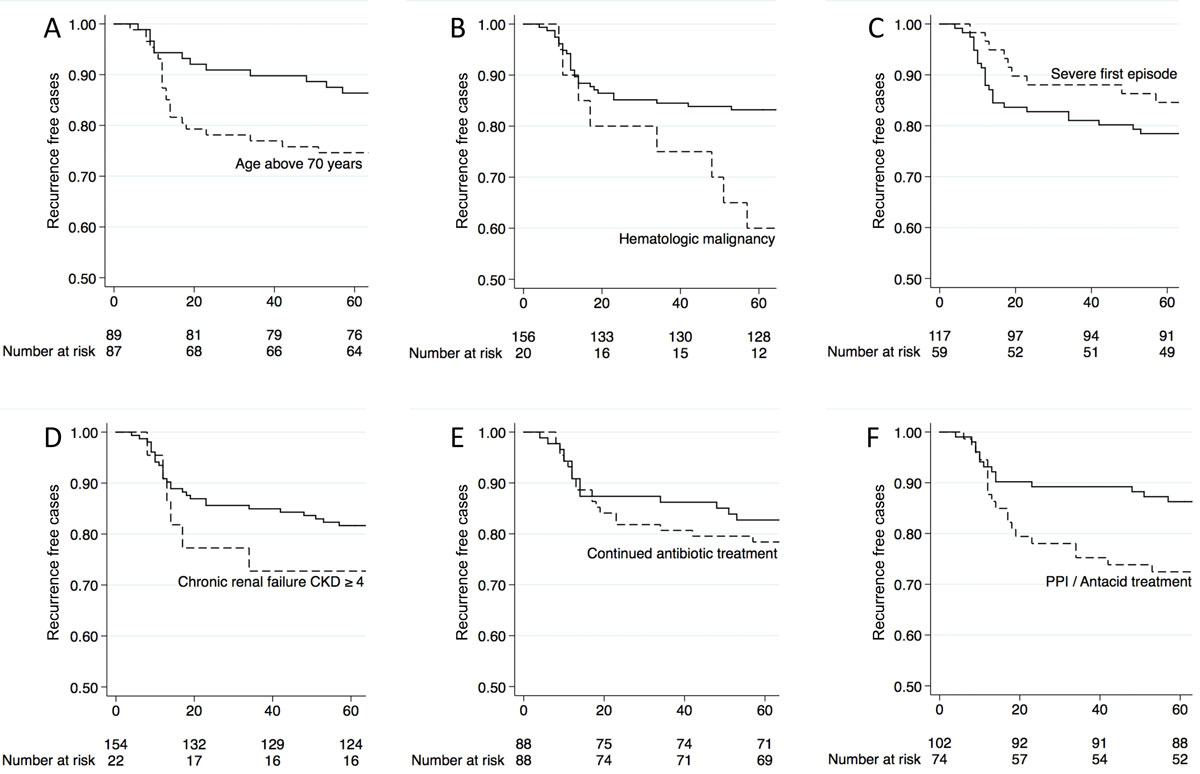 Figure 2 Kaplan-Meier curves showing Clostridioides difficile infection (CDI) recurrence after first episode according to risk factors (shown with the dashed line) of recurrence. A: age >70 years; B: haematological malignancy / leukaemia; C: severe first episode; D: chronic renal failure CKD ≥4; E: continued antibiotic treatment other than for CDI; F: proton pump inhibitor (PPI) or antacid therapy.