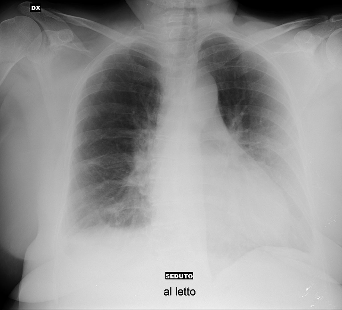 An anteroposterior chest x-ray with the patient in bed and in the supine position, showed “asymmetric” and bilateral diffuse “patchy” parenchymal opacities [22], more marked in the left hemithorax where they were present from the apex to the base (fig. 1). The opacities were predominantly supleural and with a mantellar distribution. They were accompanied by a veil of moderate bilateral pleural effusions, once again more prominent in the left hemithorax.