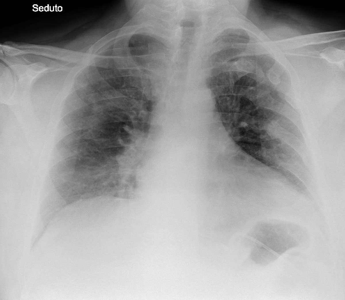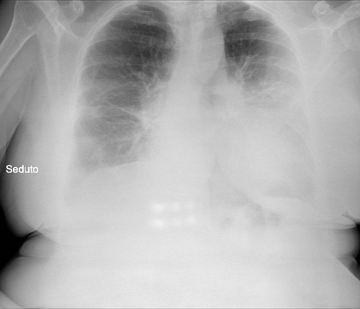 Figure 1 Chest x-ray of patient 1 on admission, 10 March 2020. Courtesy Ospedale di Sassuolo. In addition to the morphological abnormalities due to the past medical history of the patient and the more recent alterations described in the CT scans performed on 20 February 2020, this image shows opacities strongly suspicious of SARS Cov-2 pneumonia (see description by the radiologist in the text).