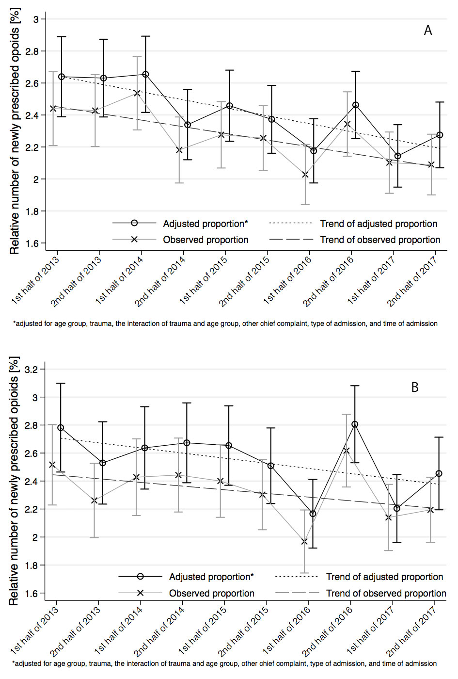 Figure 2 Observed and adjusted relative numbers of incident opioid prescription, i.e., newly prescribed opioids in opioid-naïve patients (A) in all patients, n = 199,299; (B) in outpatients, n = 134,468. The relative number per 6 months with accompanying 95% confidence interval and linear trends are presented.