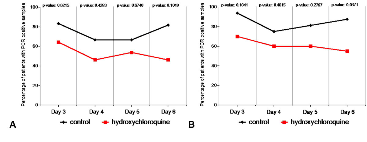 To address the implications of this oversight, we re-analysed the control and hydroxychloroquine-treated patient data from Gautret et al. table 3, excluding the missing datasets noted above (see table S1 in appendix 1). There were no significant differences between the virological clearance rates of control and hydroxychloroquine-treated patients on treatment days 3, 4, 5, or 6 (fig. 1A, table S1). This is in stark contrast to the analysis of Gautret et al, analysis, which reported significant differences between the groups starting as early as day 3 and persisting until day 6.