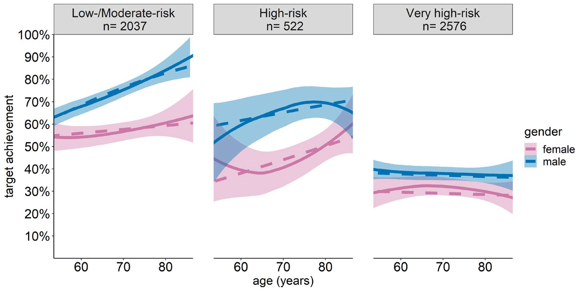 Figure 3 LDL target achievement by cardiovascular risk, age and gender. Target achievement plotted with respect to patient age, stratified by CV risk category and gender. Solid lines and CI represent empirical data, while dashed lines represent the predicted values based on the regression analysis. Data visualisation was restricted to ages 55–85 years due to limited sample sizes at the tails of the distributions.