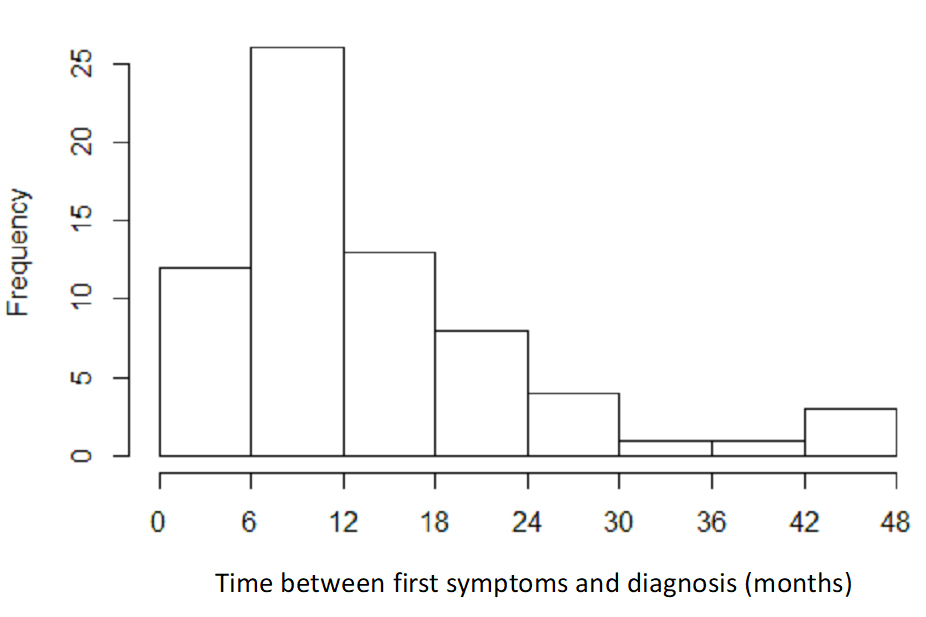 Figure 2 Distribution of delay between first symptoms according to medical history and diagnosis; n = 68 subjects. Median (Q1–Q3) 11.1 (6.8–18) months