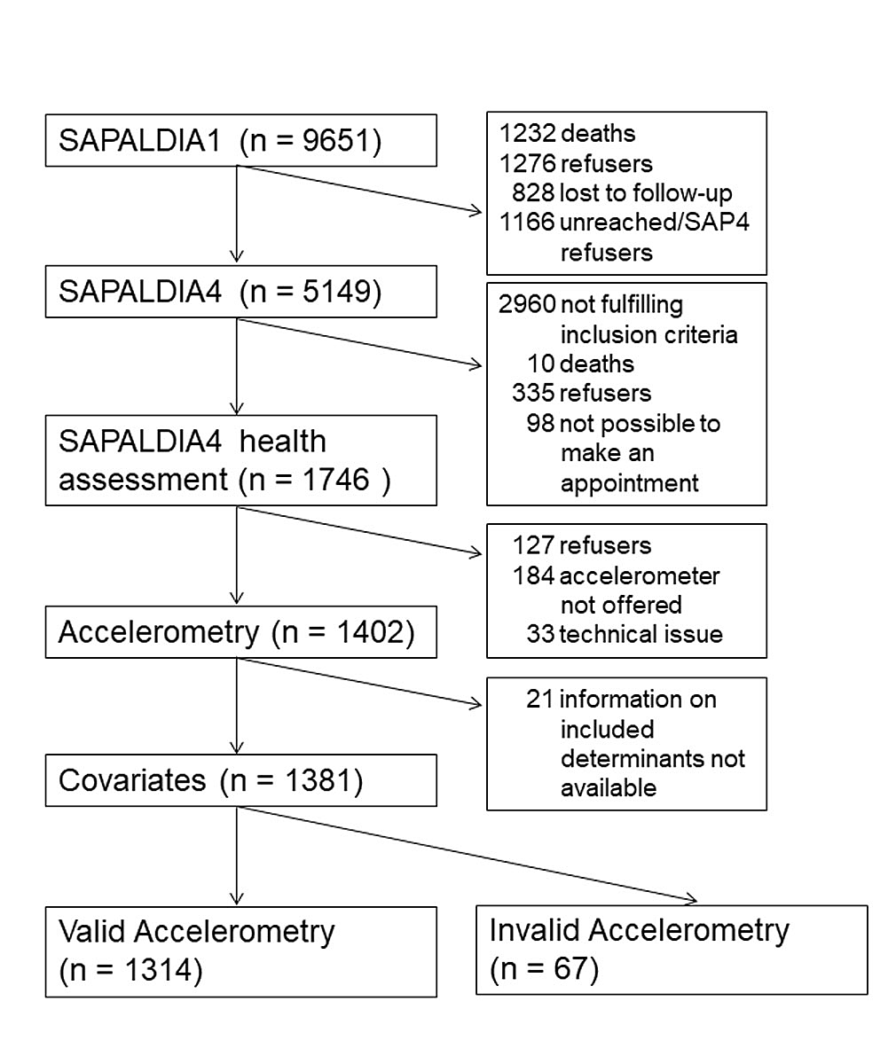 In a second step, chi2-tests were performed to evaluate bias due to invalid accelerometry data. We compared characteristics of SAPALDIA4 52+ participants providing valid versus non-valid accelerometry data. Participants with invalid data were excluded from further analyses.