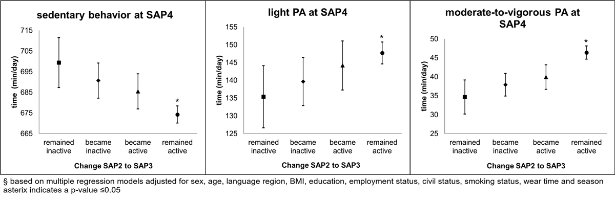 Table S4 Covariate adjusted mean minutes per day spent in specific levels of physical activity intensity objectively measured at SAPALDIA4, according to self-reported moderate-to-vigorous physical activity change patterns between SAPALDIA2 and SAPALDIA3 (remained active n = 87; became inactive n = 162; became active = 175; remained active = 729) according to Swiss recommendation for Physical Activity cutoffs.