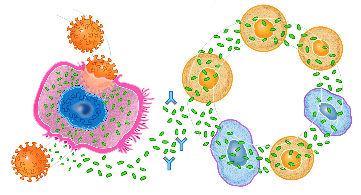 Figure 1 When the COVID-19 virus infects the cell of the lung it induces the release of inflammatory cytokines (depicted as small green discs) that trigger various cells of the immune system into a confused, vicious circle that ultimately damage the host’s tissues. This inflammatory reaction will be worse in persons who already have chronically activated inflammatory cells. This inflammatory reaction can be neutralised (stopped) with the administration of specific monoclonal antibodies (depicted here as the blue Y shaped figures). Illustration by Fulvio Bernardini Fuller©