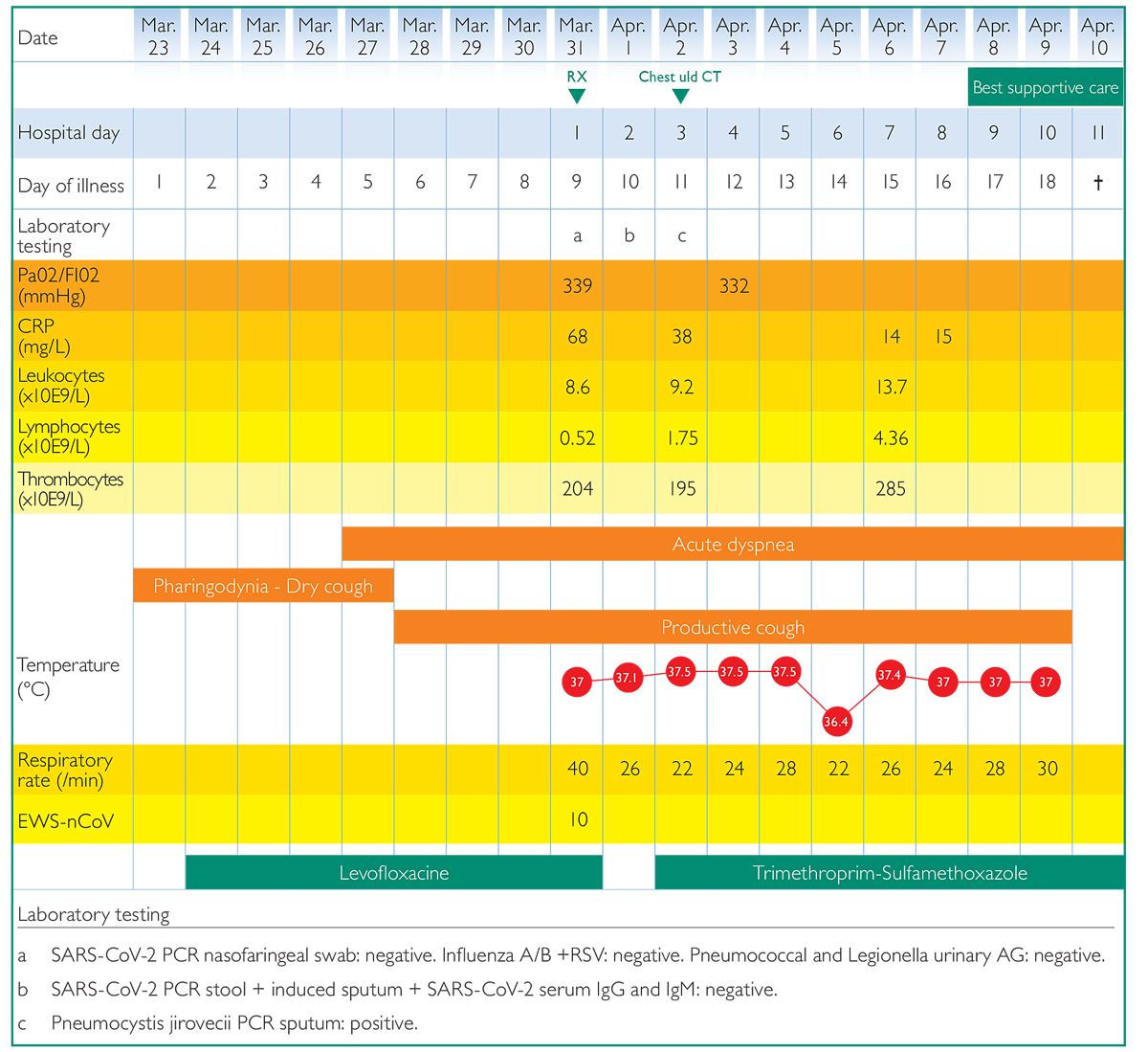 Figure 2 Clinical course during hospital admission, with details of signs and symptoms, laboratory findings, imaging and therapy received.