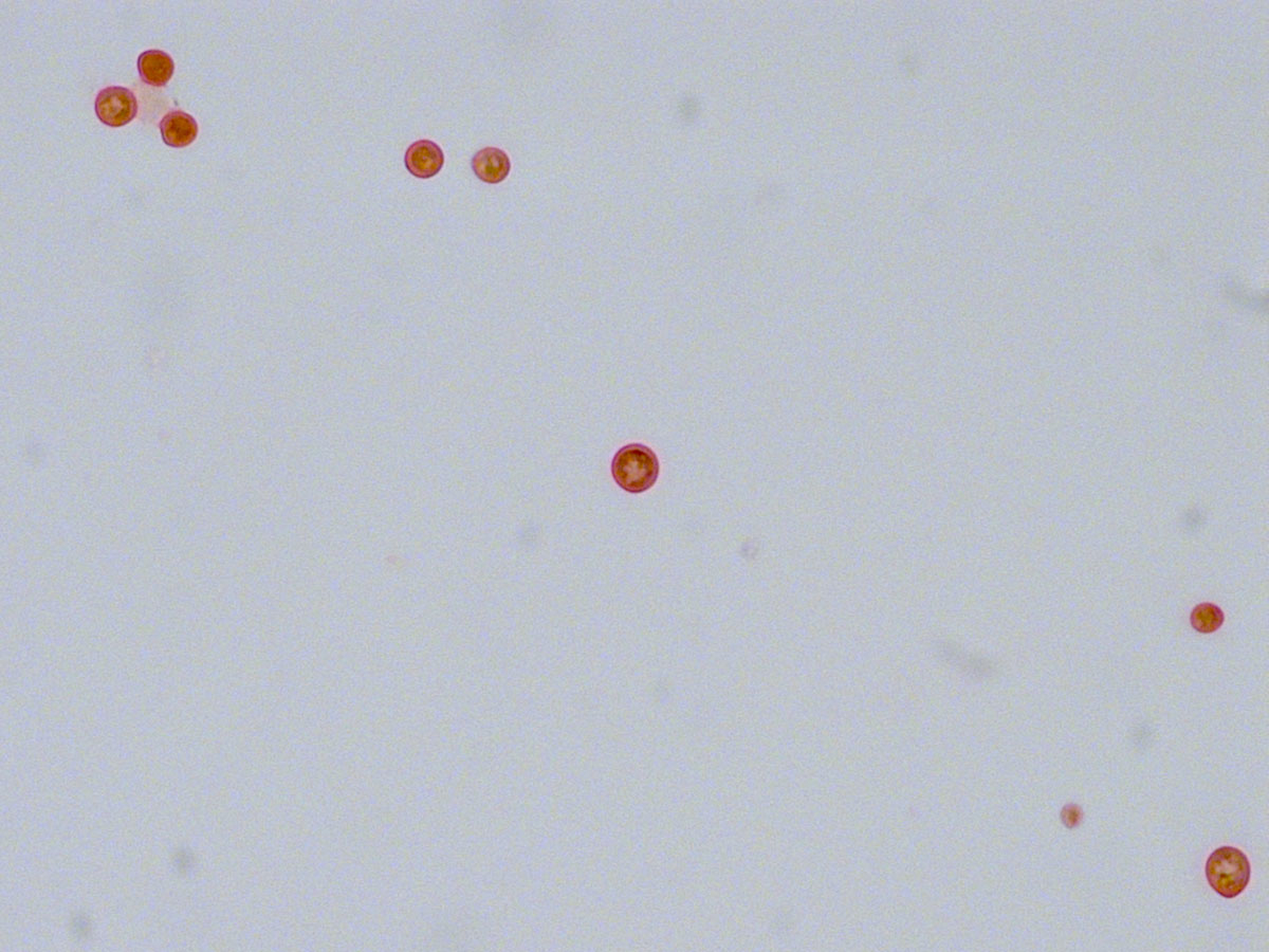 Figure 3 Mucicarmine stain of broncho-alveolar lavage fluid (magnification 63×) confirmed a cryptococcal infection, by highlighting the yeast’s characteristic large polysaccharide.