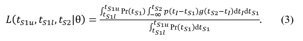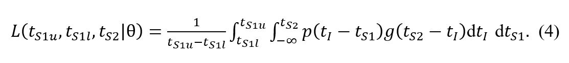 Concretely, the probability under model ϴ to observe a window of symptom onset of the index case (tS 1 l , tS 1 u ) and symptom onset in the secondary case on day tS 2 is defined in the original manuscript as