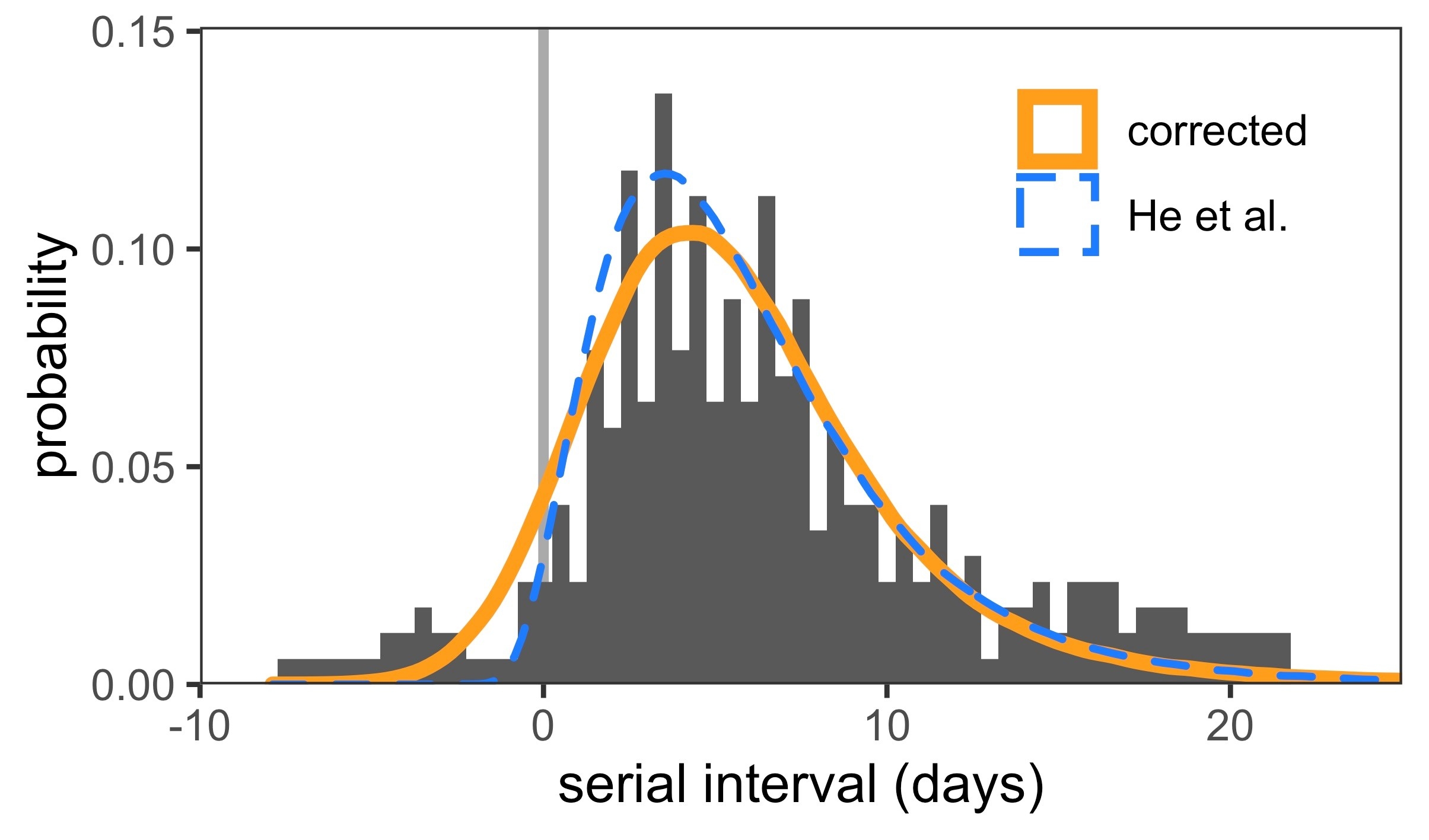 A second less consequential problem in the methodology of He et al. [1] is that a normalisation factor is missing in the likelihood function when considering transmission pairs with serial interval estimates specified by a range. Ignoring this normalisation awards higher weight to transmission pairs with more uncertain symptom onset times of the index case.