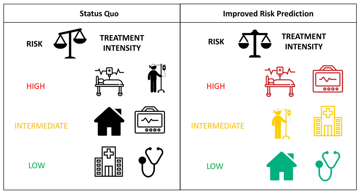 Figure 1 Status quo shows the current mismatch between risk categories and the intensity of management both in-hospital and immediately after discharge. For example, a recent study showed that the majority of patients classified as low-risk using a heart failure risk score were hospitalised despite the fact that adjusted ambulatory follow-up might have been the more accurate approach [8]. Improved risk prediction using clinical risk scores or biomarkers could contribute to more effective, risk-adjusted management. Therefore, high-risk patients could be transferred to an intensive care unit with continuous monitoring (marked in red), intermediate-risk patients could be hospitalised or temporarily treated in an intermediate care unit (marked in yellow), whereas low-risk patients could be safely discharged home with an adjusted ambulatory follow-up (marked in green).