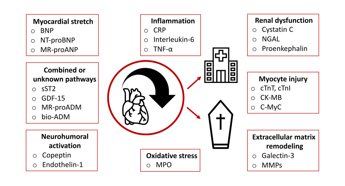 bio-ADM = bioactive adrenomedullin; BNP = B-type natriuretic peptide; CK-MB = creatine kinase myocardial band; C-MyC = cardiac myosin-binding protein C; CRP = C-reactive protein; cTnI = cardiac troponin I; cTnT = cardiac troponin T; GDF-15 = growth differentiation factor 15; MMP = matrix metalloproteinase; MR-proADM = mid-regional pro-adrenomedullin; MPO = myeloperoxidase; MR-proANP = mid-regional pro-atrial natriuretic peptide; NGAL = neutrophil gelatinase-associated lipocalin; NT-proBNP = N-terminal pro-B-type natriuretic peptide; sST2 = soluble suppression of tumourigenicity 2; TNF-α = tumour necrosis factor alpha.