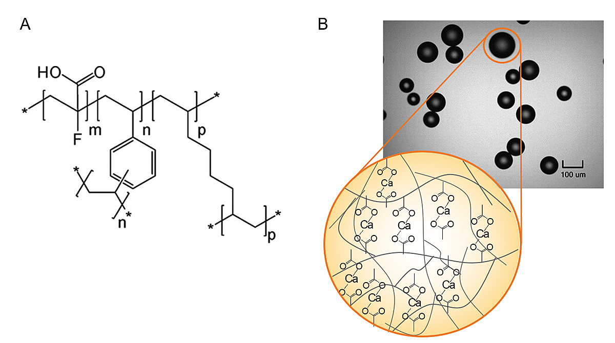A. Chemical structure of patiromer anion (m indicates number of 2-fluoro-2-propenoic acid groups; n, p, indicate number of cross-linking groups. *An extended polymeric network.