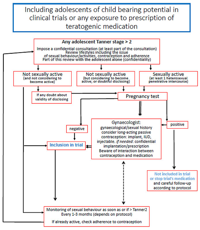 The professional(s) who will perform the assessment of the situation should be identified prior the beginning of the study and have experience in adolescent medicine and health. Figure 2 provides an algorithm that should assist the investigators in making decisions. As many trial protocols also request contraception from fertile male participants, part of the assessment procedure described below may apply to them as well (first bullet points).