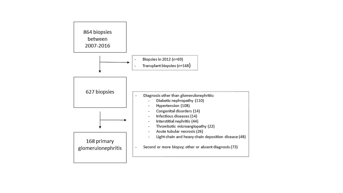 We retrospectively collected all kidney biopsy reports between 2007 and 2016 (n = 867), from which we removed transplant biopsies and all biopsies performed in 2012. Thereafter, we excluded 386 biopsies with other aetiologies such as diabetic nephropathy, vascular/ischaemic nephropathy or congenital disorders, biopsies with no diagnosis or an uncertain diagnosis, and biopsies in patients with glomerulonephritis performed for the second, third or fourth time. The selection process is detailed in figure 1. A total of 168 met the inclusion criteria, with a mean of 18.7 biopsies per year for nine consecutive years. During this time period, 52.4% of biopsied patients were men. The mean age was 50 years.