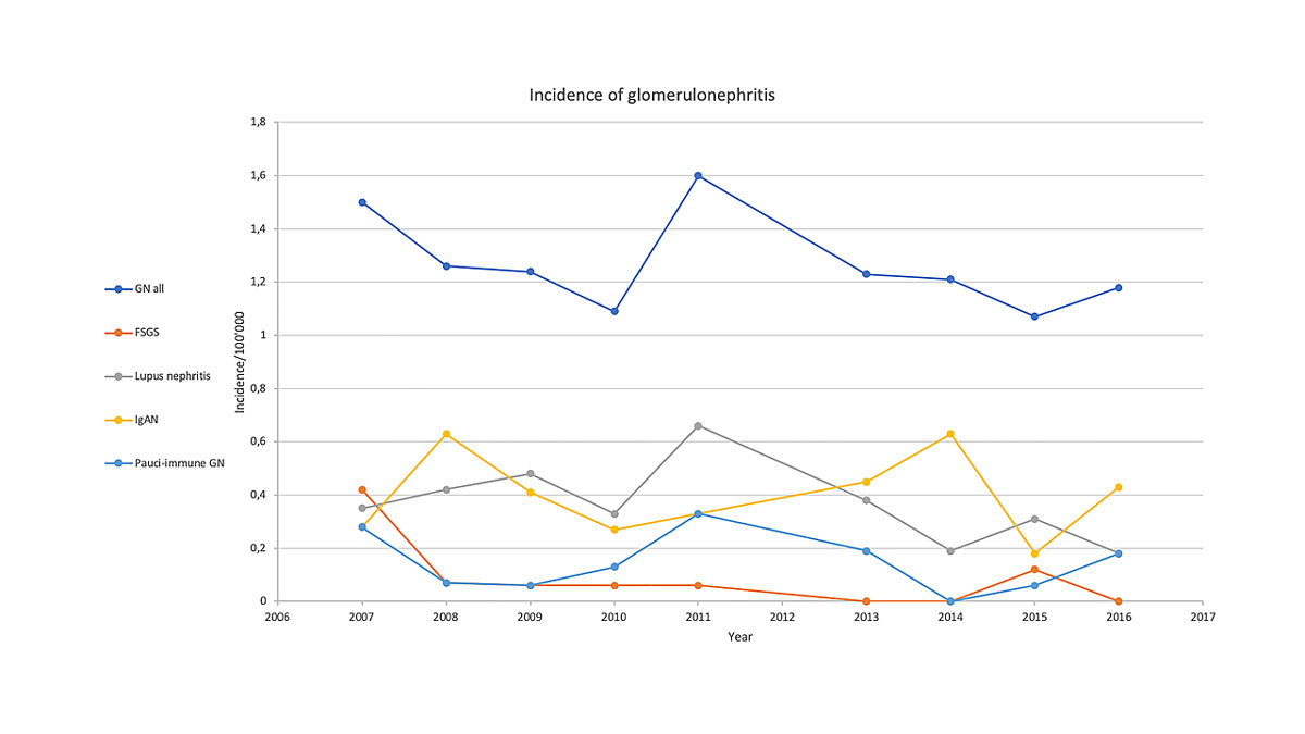 Regarding the stable incidence of glomerulonephritis over time in our study, international studies describe various trends, depending on the country and the underlying type of glomerulonephritis.