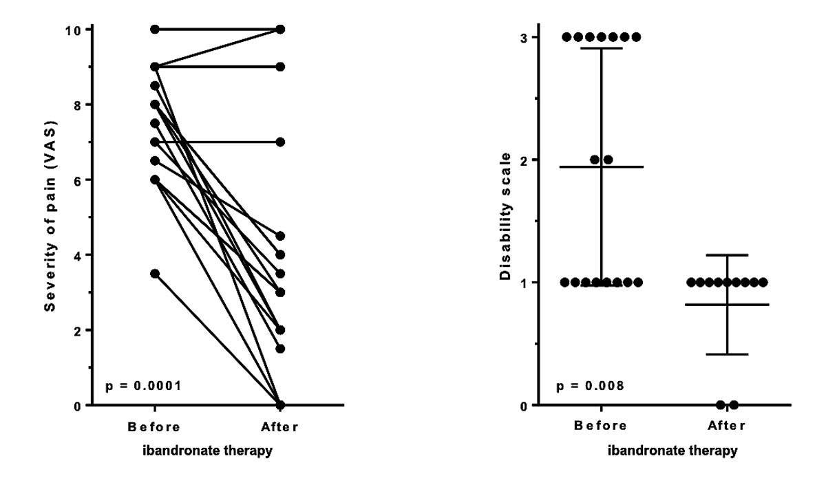 Ten participants (55.6%) had two administrations with a mean interval of 31.4 days (range 23–43 days). The other eight participants received one dose of ibandronate; in two of these cases, no improvement could be monitored. None of the participants received three doses of ibandronate.