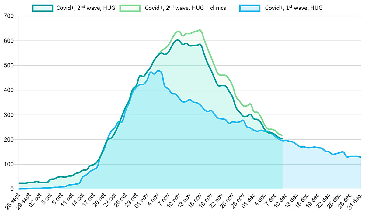 After the first reported case in Switzerland on 25 February 2020, the COVID-19 epidemic spread rapidly in our country, reaching the highest reported cumulative prevalence per head of population in the world in March. The Geneva canton was severely hit and initially the Geneva University Hospitals (HUG) were selected as the only COVID-19 referral centre in the region. During the first wave, the COVID-19 peak hospitalisation number was 478, with a peak of 67 intubated patients. Since October, we are facing even a bigger second wave and Geneva is again one of the most severely affected region in Europe (fig. 1), with a peak of 642 hospitalisations on 16 November 2020 and a peak of 32 intubated patients [4]. As of 10 December, a total of 605 cumulative deaths due to COVID-19 have been reported in the Geneva canton [5].