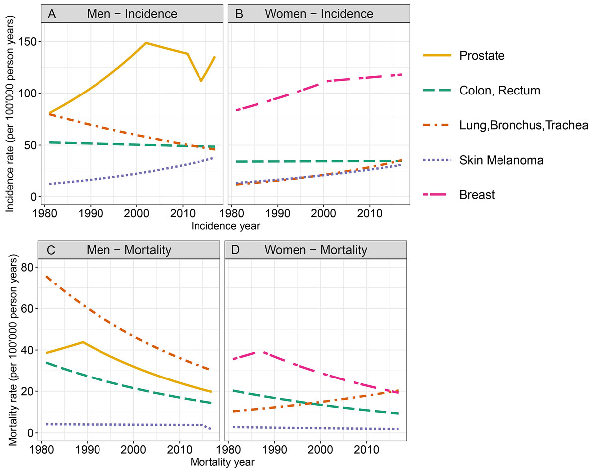 Figure 1 Age-standardised incidence and mortality rates for cancers of the prostate, breast, colon/rectum, and lung, as well as for melanoma from 1981 to 2017, by sex, in the canton of Zurich.