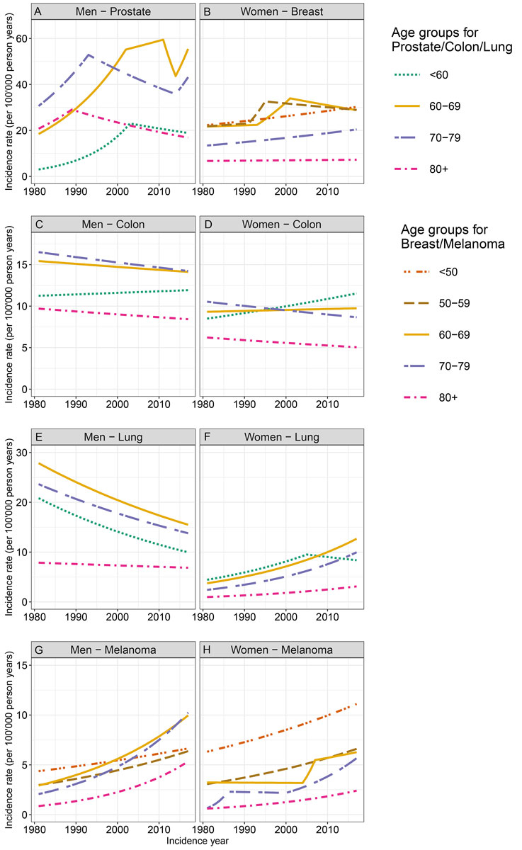 Breast cancer incidence in women was highest in the three age groups up to 69 years both in 1981 and in 2017 (fig. 2B). The incidence trend was increasing in all age groups, although it was only significant in women in the <50 and 70–79 age groups. Joinpoints in the age groups between 50 and 69 years indicated the steepest increase in the 1990s. The incidence rate of colon/rectum cancer in women was highest for the 70–79 age group in 1981, but highest for the age group <60 years in 2017 (fig. 2D). An increasing trend was observed in the youngest age group, a stable trend in 60–69-year-old women, and decreasing trends in the older age groups. Lung cancer incidence increased significantly in women in all age groups with AAPC ranging between 1.8 and 4.0; it was highest in those younger than 60 years in 1981 and in those aged 60 to 69 years in 2017 (fig. 2F). An increasing trend for melanoma in women was observed in all age groups (although not significant for those aged 60-69 years) with AAPC ranging between 1.6 and 6.2; larger (positive) AAPC were observed for older age groups (fig. 2H). The incidence rate was highest in the age group <50 years throughout the study period.