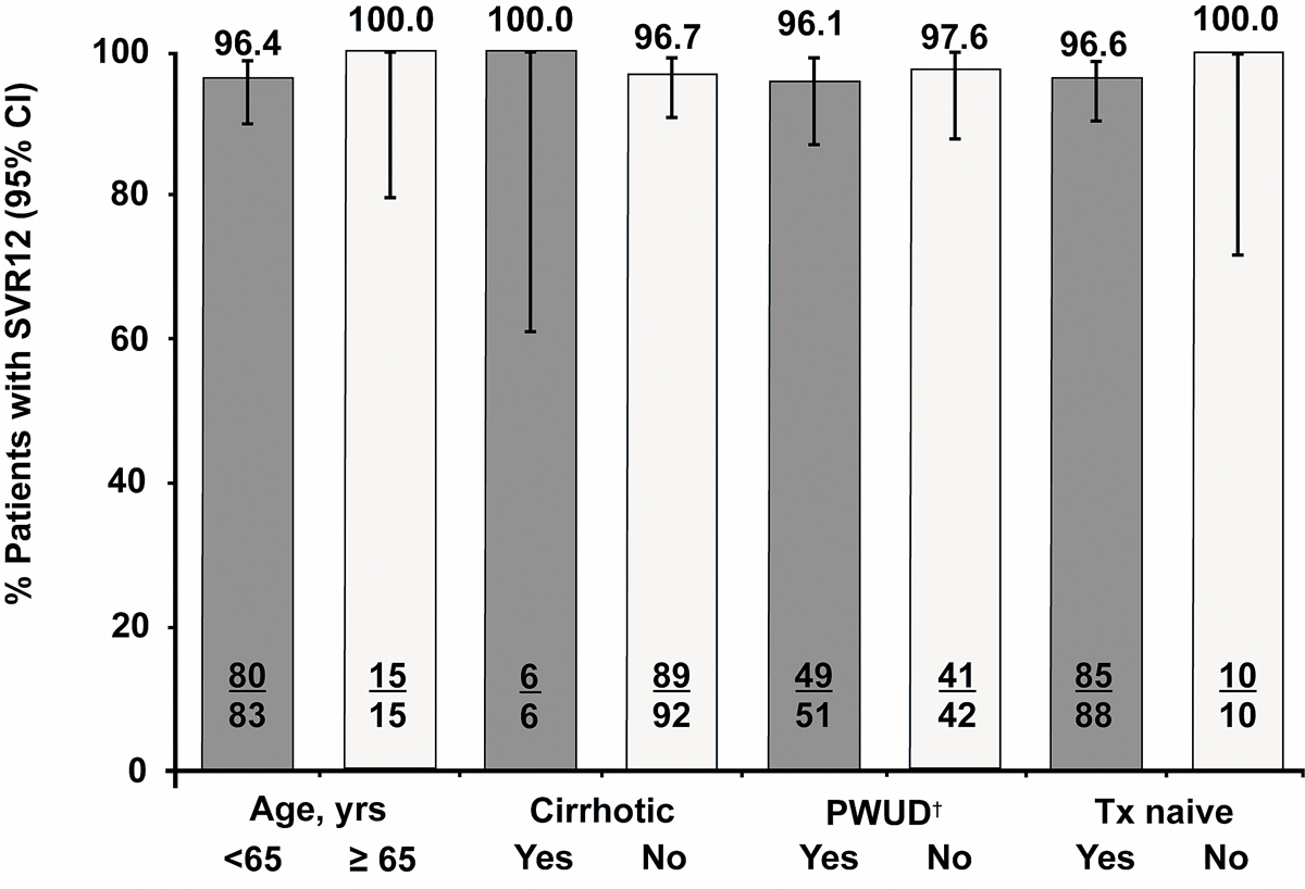 The primary objective of the study was to describe the effectiveness of GLE/PIB, as evidenced by SVR12, overall and in the following subpopulations of interest: HCV genotype 1 to 6, cirrhotic or non-cirrhotic (investigator assessment), HCV treatment-experienced or -naïve, elderly or non-elderly (≥65 or <65 years), and former or current illicit drug users (PWUD [people who use [illicit] drugs]) or non-PWUD.