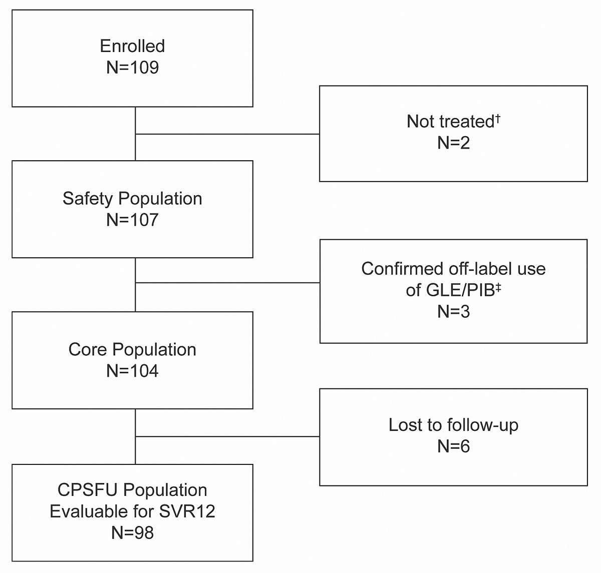 A total of 109 patients from Switzerland with chronic HCV infection were enrolled. Of these, 107 received at least one dose of GLE/PIB, 104 started the regimen as recommended for their disease characteristics (core population) and 98 were evaluable for SVR12 (fig. 1). Mean treatment adherence (patient-reported % of prescribed tablets taken) was ≥99% for all patients with data available (n = 107; range 88% to 100%).