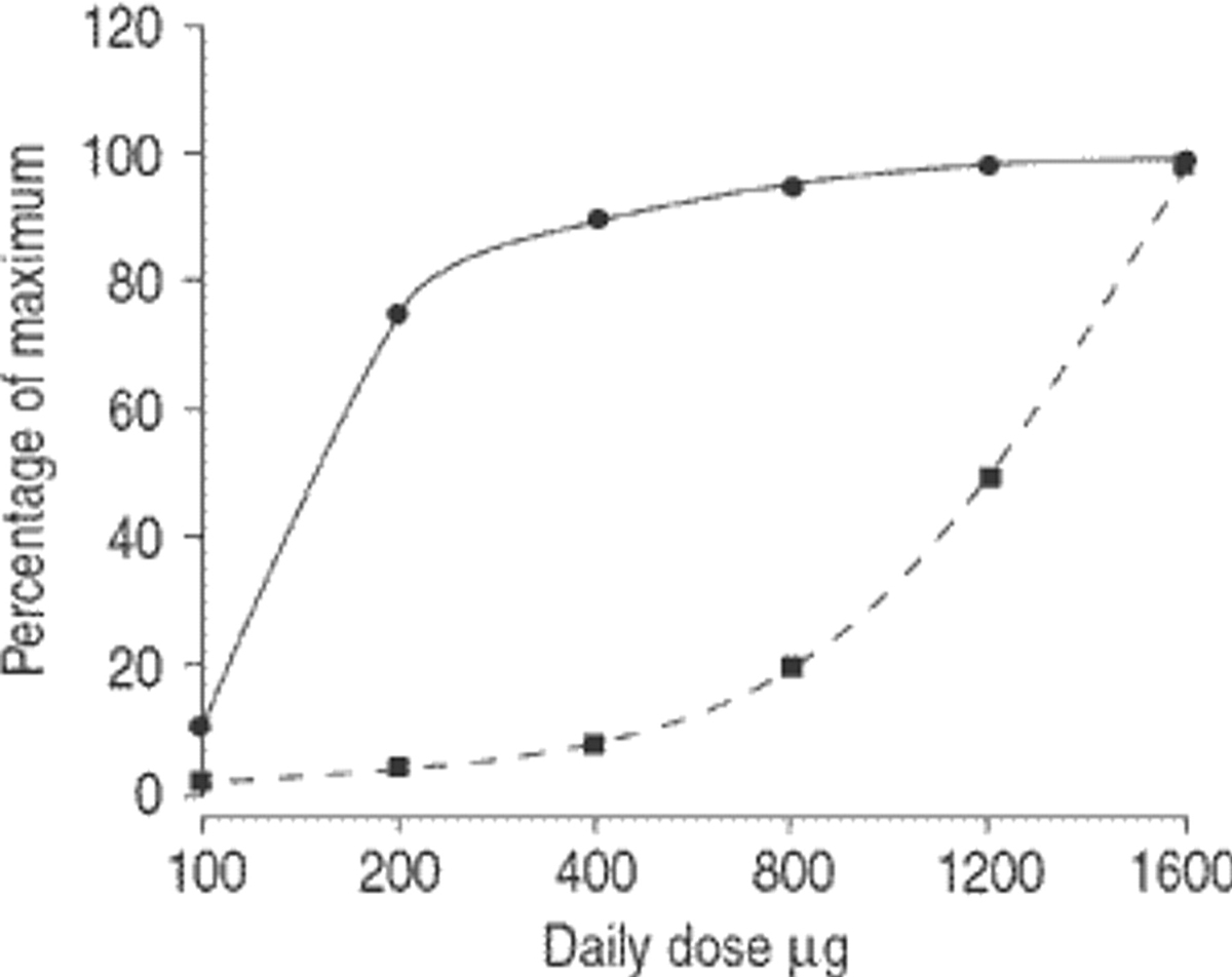 Figure 1 Pulmonary anti-inflammatory effects (—) and undesired systemic side effects (- - -) if inhaled corticosteroids (ICSs) at different daily doses. The figure is intended to illustrate the basic principle of these two different dose-response curves. The curves depicted here belong to a hypothetical ICS; exact values on the X axis may differ between ICSs and patients. (Reproduced with permission of the © ERS 2020: European Respiratory Journal. 2001;17(2):287–94.)