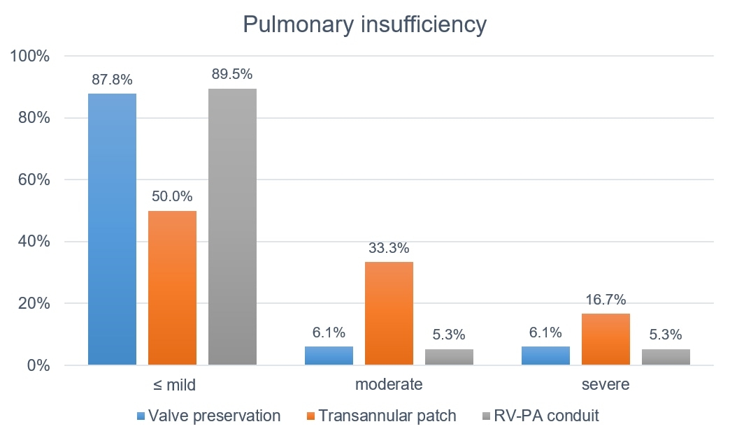 Figure 2 Proportion of patients by degree of pulmonary insufficiency and type of surgical correction. RV-PA = right ventricular-to-pulmonary artery