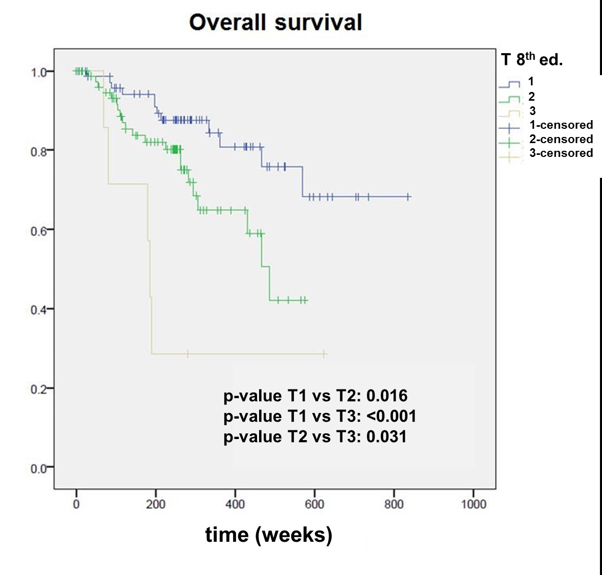 Figure 3 TNM 8th edition. Overall survival: T1 (n = 73), T2 (n = 81) and T3 (new, n = 7); here, all the three curves show a significant difference. The difference between T1 and T2 becomes even more significant.