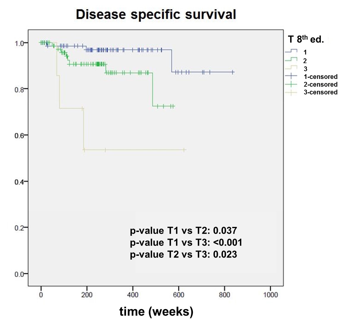 The Kaplan Meier survival curves stratified by pT category according to both editions are shown in figures 2–5 . The 7th edition reveals a statistically significant difference between pT1 and pT2 tumours for overall survival (p = 0.025), but not for disease-specific survival (p = 0.091). The 8th edition was able to well discriminate between pT1, pT2 and pT3 for both overall (pT1 vs pT2, p = 0.016; pT2 vs pT3, p = 0.031) and disease-specific survival (pT1 vs pT2, p = 0.037; pT2 vs pT3, p = 0.023).