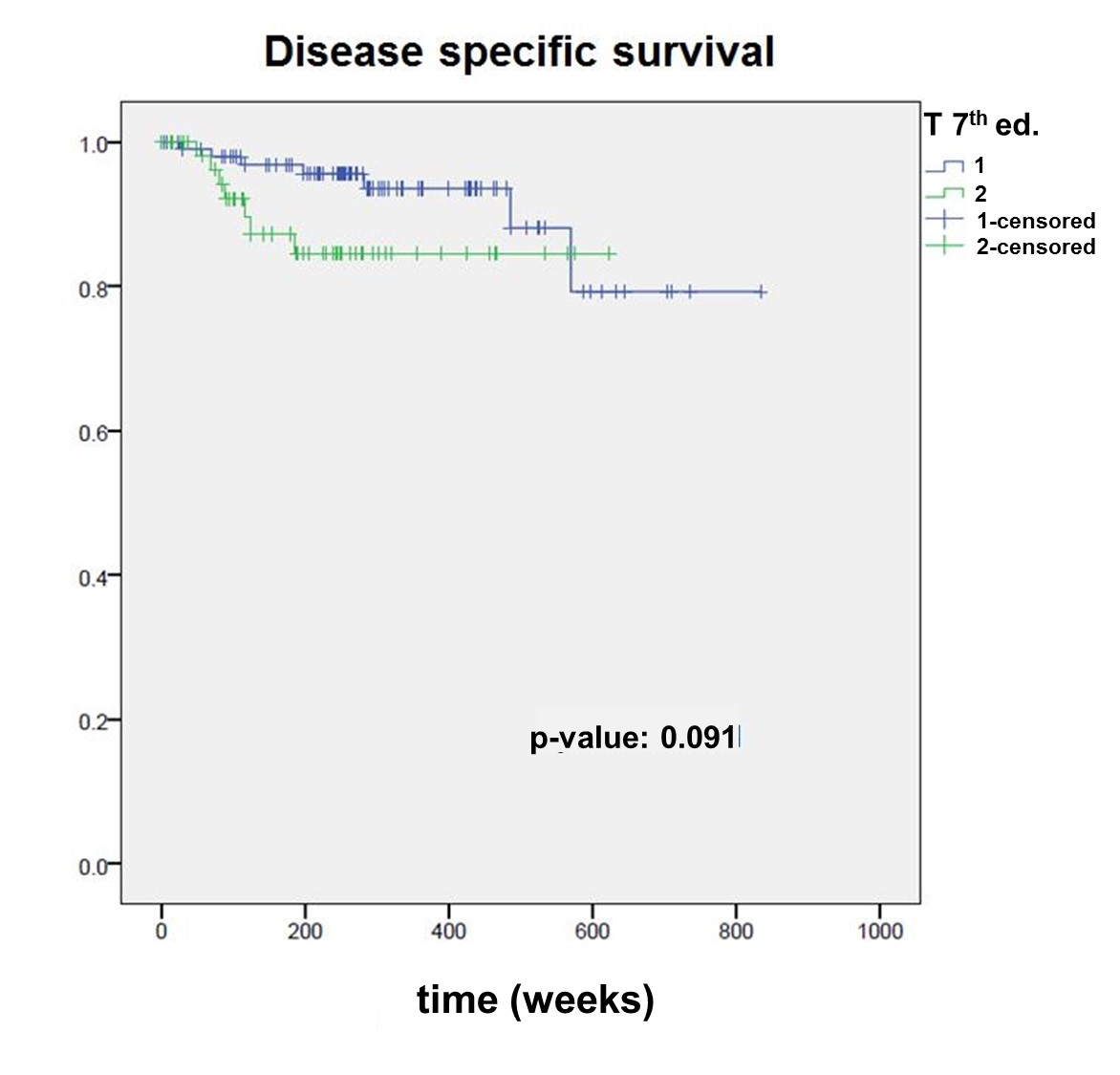 Figure 4 TNM 7th edition. Disease-specific survival: T1 (n = 102) and T2 (n = 59); here the difference between the two curves is not significant but shows a trend towards worse survival for T2 patients.